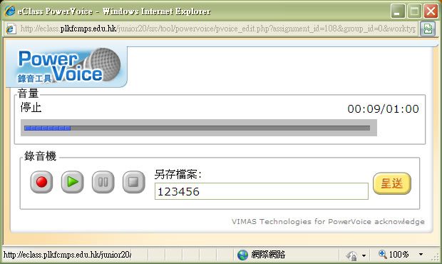到逹以下介面後按一下錄音(紅色圓點),之後對著麥克風說話。 錄音完成後按停止建(正方形鍵),再在"另存檔案"下方框入檔案名字,再按呈送。